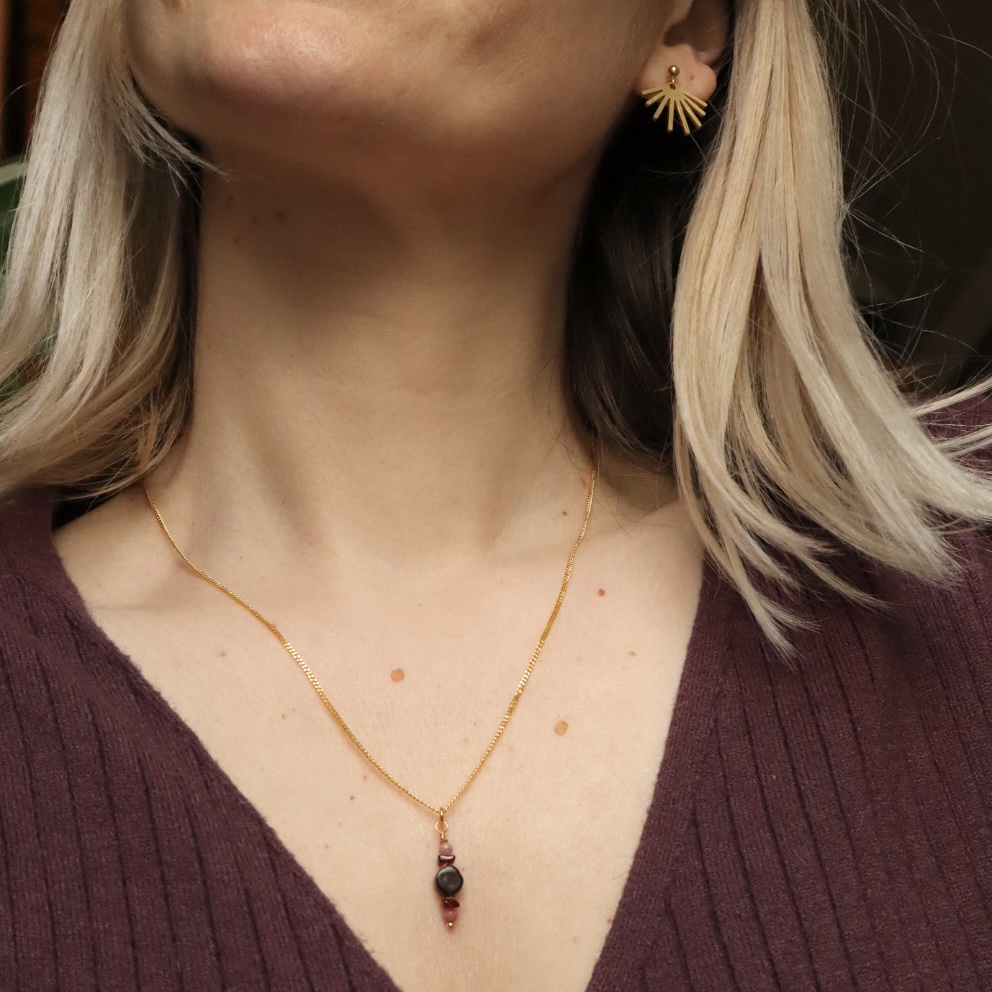 Zij heeft een hanger van dieprood granaat en roze rhodoniet kraaltjes.
