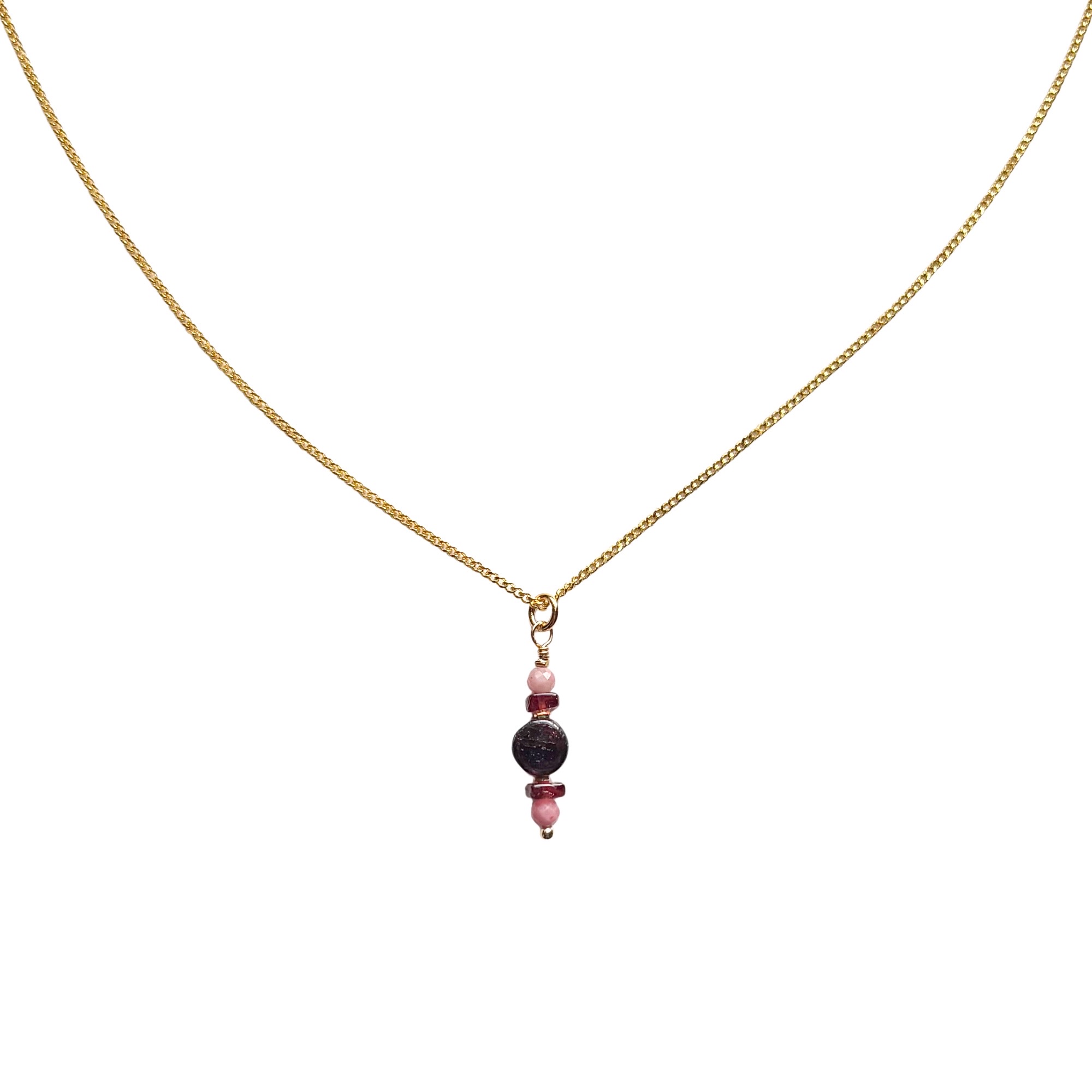 Deze ketting bestaat uit (goud vermeil) sterling zilver materiaal en een hanger van rode granaat en roze rhodoniet.